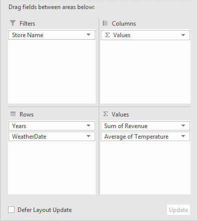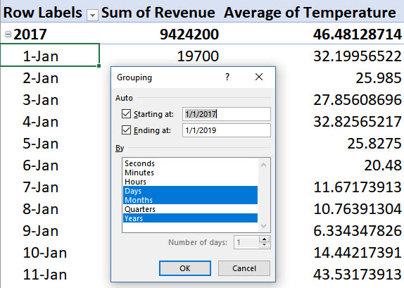 I also found it helpful to adjust the Groups in the pivot table to add Day level rather than just Months or Years. This will give me the pivot table I need to compare Revenue and Temperature by every date for the last two years.