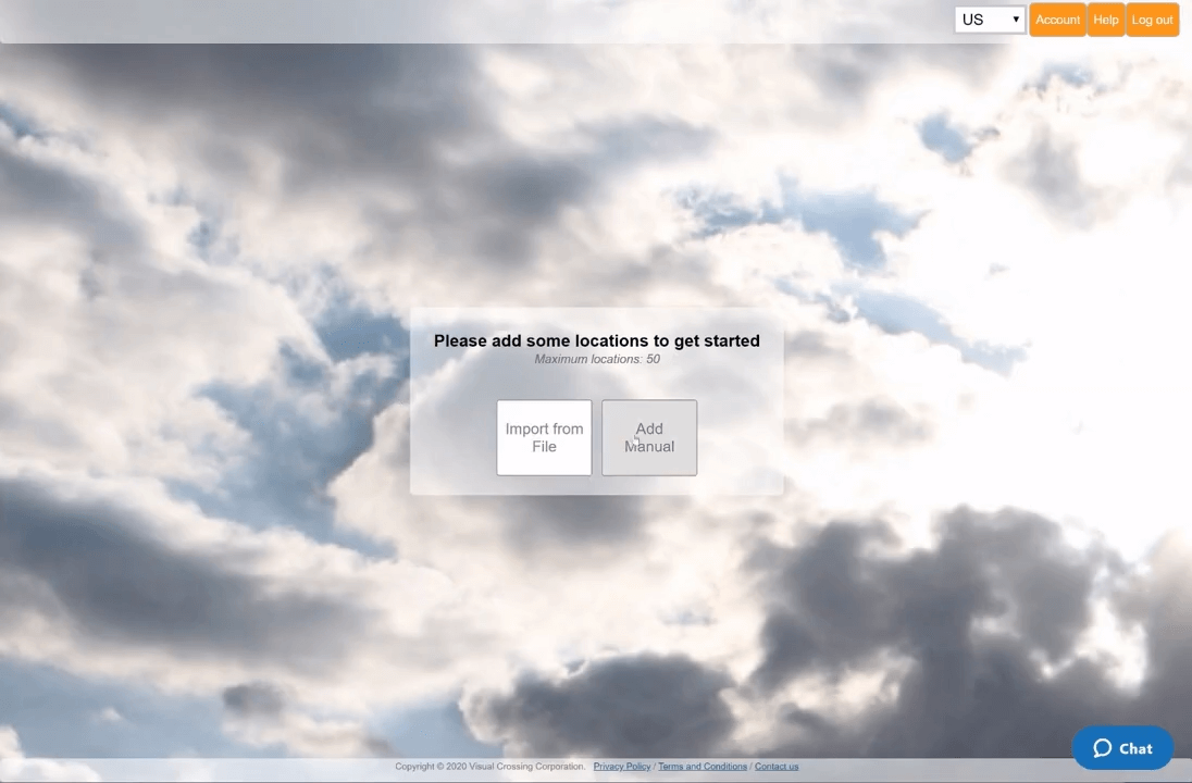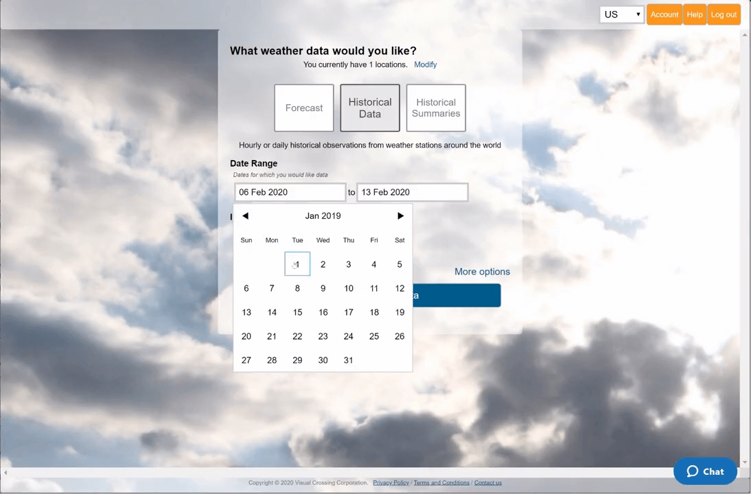 Once on the log-in page, you will need to sign into your Visual Crossing Weather account. If you don’t already have an account simply click on the orange button on the right-hand side of the login box. Your free trial account will give you instant access to historical weather data for any location around the globe.