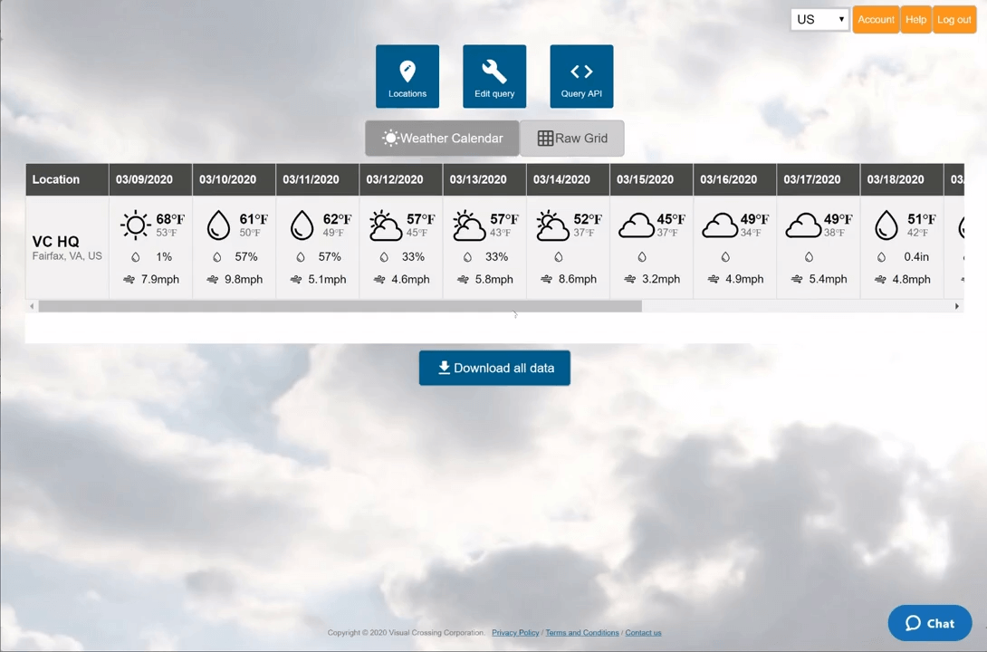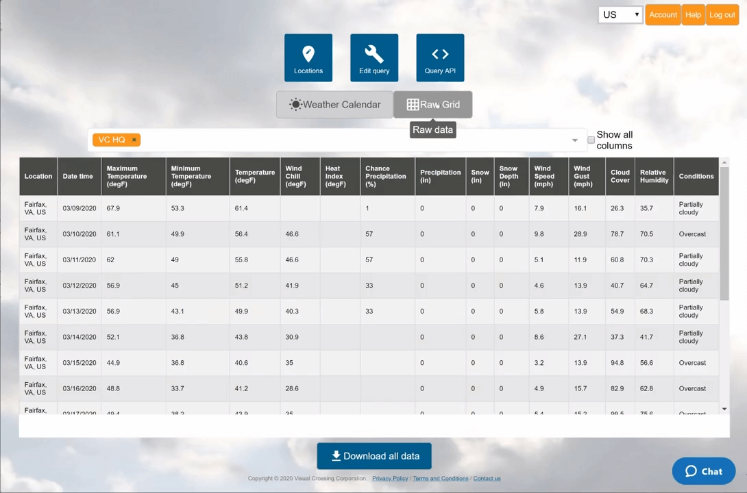We’ll start by going to the Weather Data Query Page. We can retrieve live data directly into the browser for free on this page. We can also construct the Weather API query or download weather data using this page.