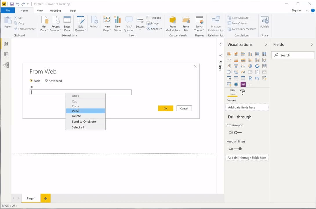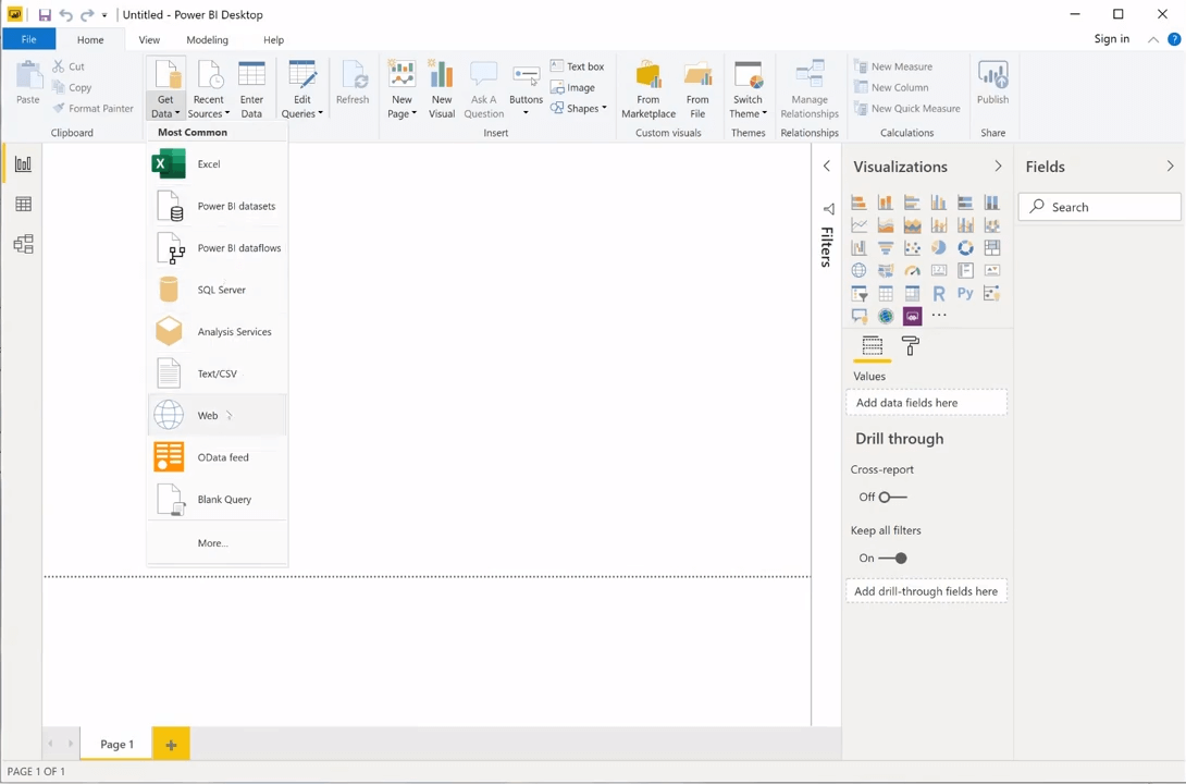 Alternatively, you can access the Get Data -> Web from the toolbar by clicking ‘Get Data’ and then web.