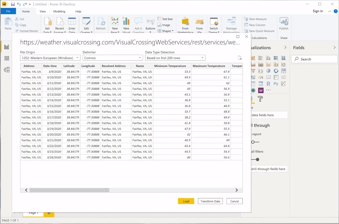 When we click on the Load button, Power BI will fetch the entire forecast dataset and make it available for analysis. Once loaded, we can immediately begin using our weather data in our Power BI analyses. We can not only analyze the data directly, we can correlate weather with existing business data to make and adjust plans such as staffing levels, supply levels, optimal operating hours, and more.