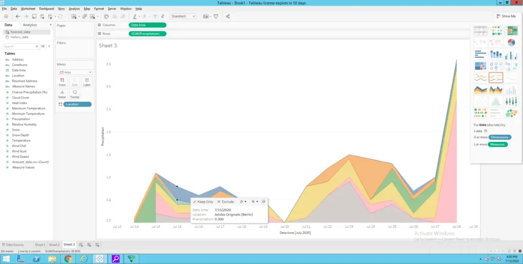 Tableau Desktop now displays the full data set containing forecast metrics for the next fifteen days. The metrics include common values such as temperature, precipitation, and wind as well as less common value such as heat index, cloud cover and wind gusts. For more information on the details regarding our weather metrics, please see our Weather Data Documentation.