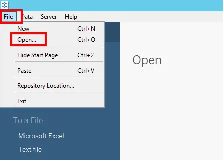 You next need to load the data file into Tableau. So choose the ‘Open…” option from the ‘File’ menu.