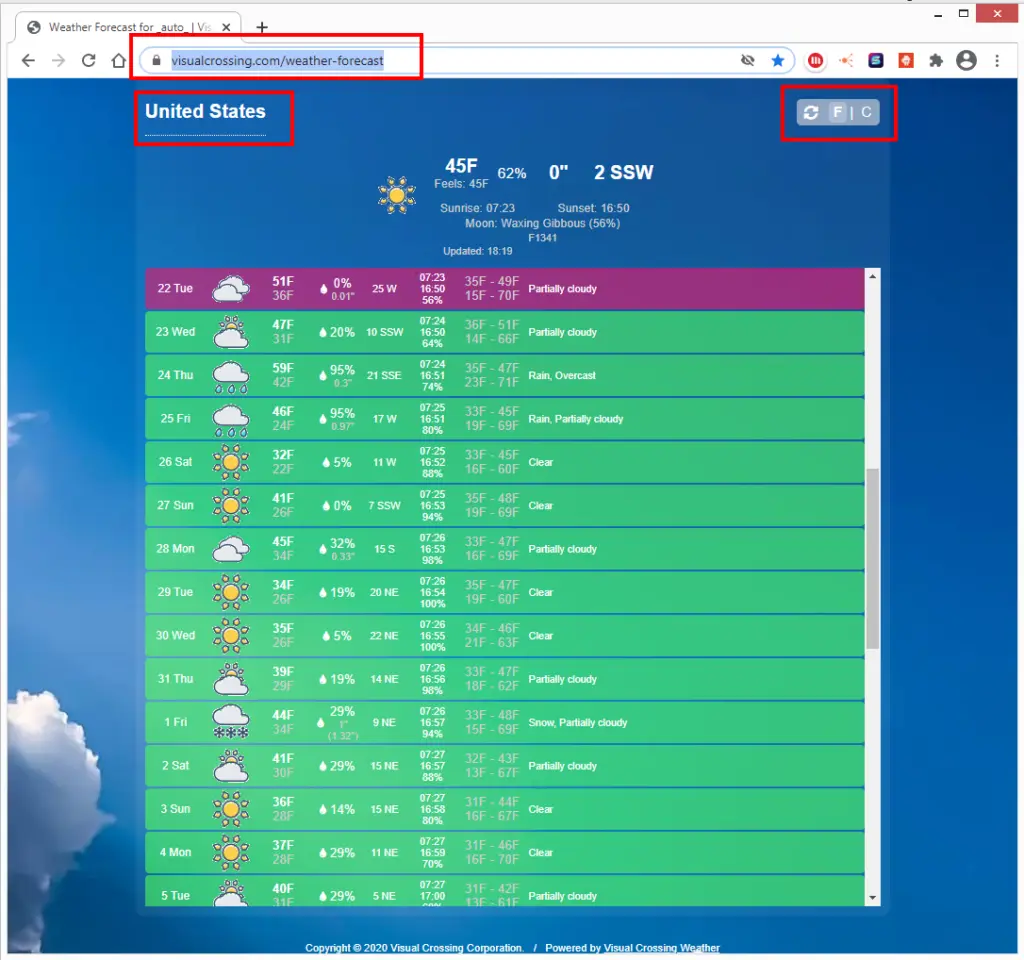 Navigate to the free Visual Crossing Easy Weather Forecast site in your web browser: https://www.visualcrossing.com/weather-forecast , enter your location of interest and your preferred measures units.