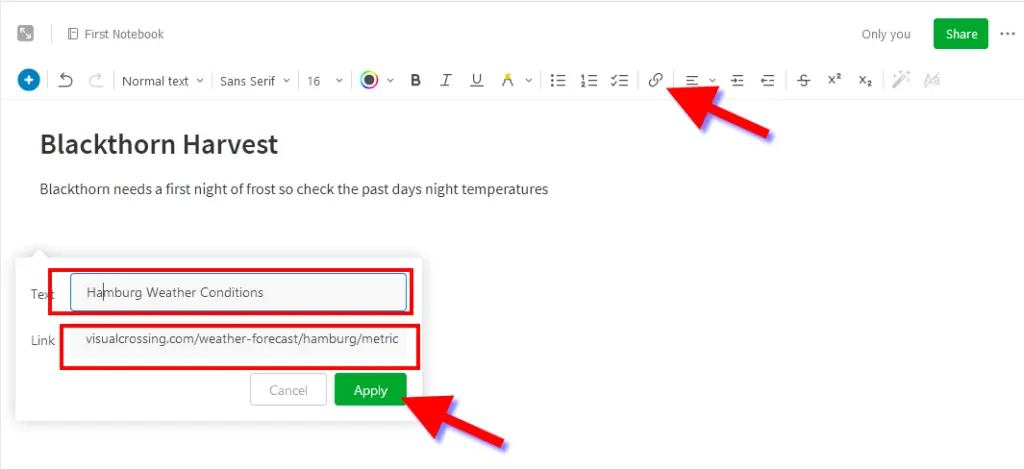Name your note and describe your task. A typical example is your blackthorn harvest. Needing a sunny day for the actual plucking and some frosty nights before. To add the direct link to the weather information hit the ‘Insert Link’ button , name your entry and paste the link generated in Step 1 of this tutorial. Finally hit the ‘Apply’ button.