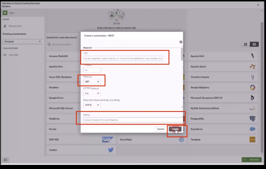 Paste the connection string generated in Step 12 into the URL a field, make sure your ‘Method’ drop down is set to ‘GET’, give he connection a suitable name and hit the ‘Create’ button.