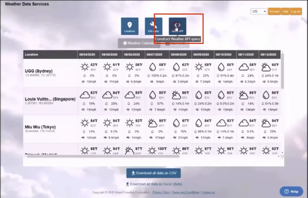 Open the Visual Crossing Weather Data Services log-in page and sign into your Visual Crossing Weather account. If you don’t already have an account, you can sign up for a free trial on the same page. Signing up for a free trial account will give you immediate access to a full 15-day weather forecast for any location.