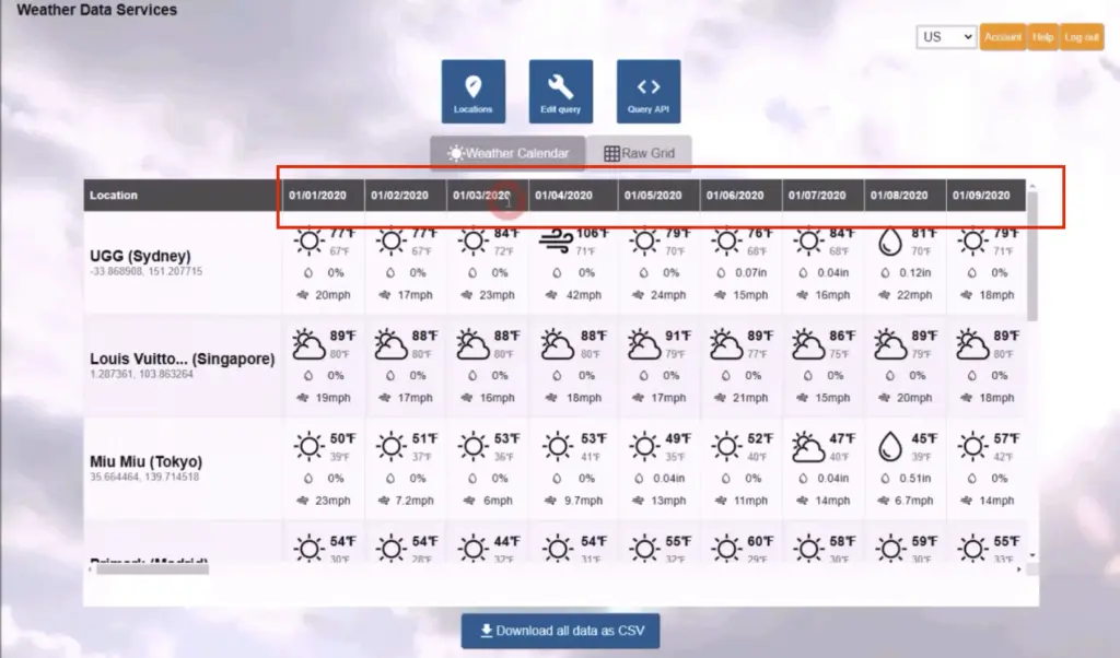 The default view for the query results is the weather calendar. This view provides a simple overview of the result data.