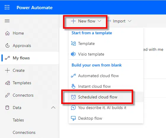 Power Automate allows to set up scheduled flows as well – to do so start with the Scheduled Cloud Flow option from the New Flow drop down menu