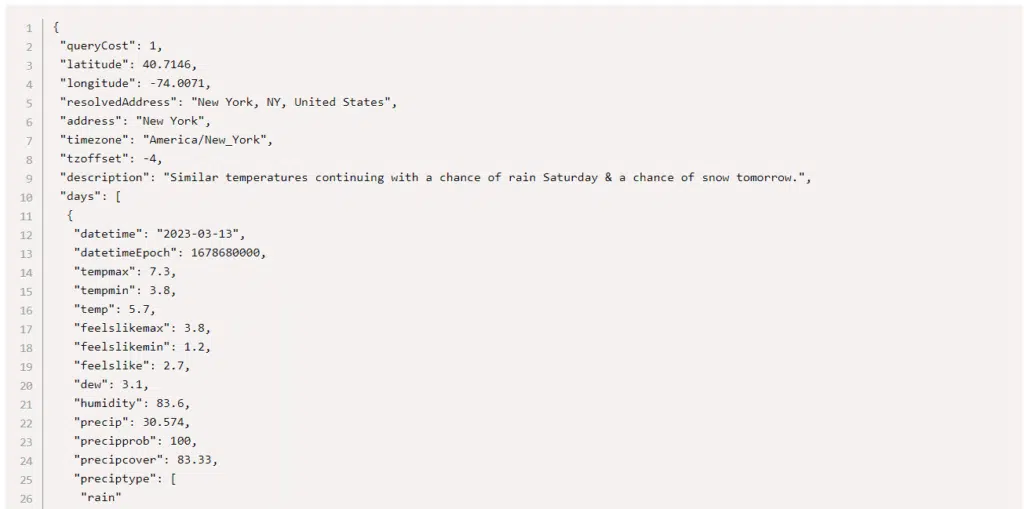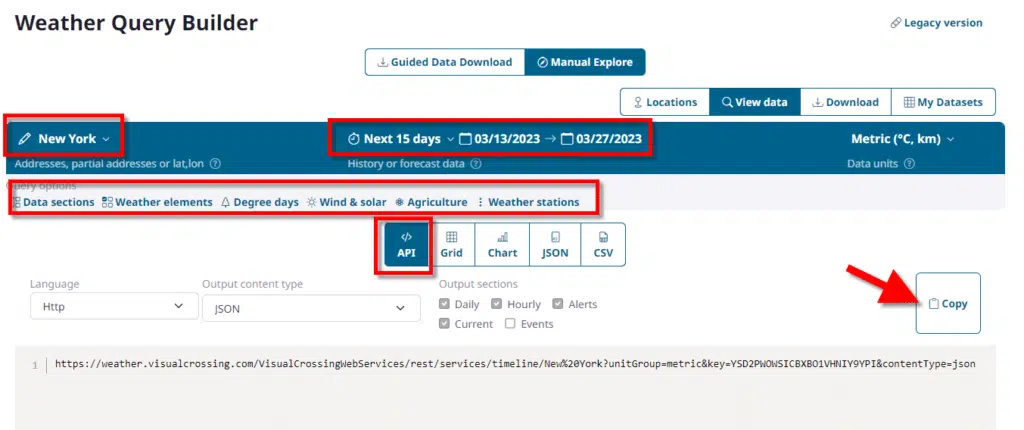 To get started we need the query string to access the data from Visual Crossing weather. Queries can be built using the query builder page or for sure be put together manually using the API documentation .