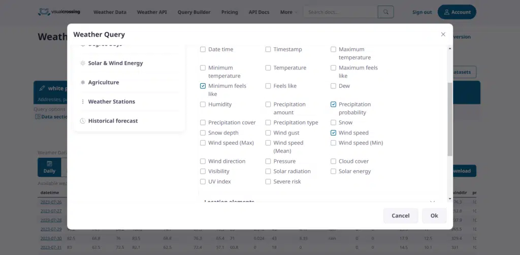 Click on the weather elements that you want to add or remove from the final data output. Checked elements will be included in the query results and unchecked elements will not be included.