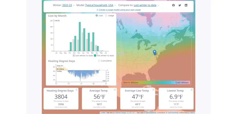 Visual Crossing’s Winter Energy Calculator shows how winter temperatures and rising energy costs affect heating energy usage and costs around the world. It combines key elements such as heating degree days, home energy usage profiles, and regional energy costs to continuously update energy usage and heating bill estimates throughout the season.