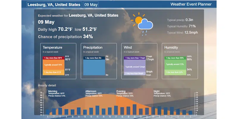 The Weather Calendar provides an overview of the forecast in a calendar format to aid in planning and the understanding of upcoming conditions. It’s interactive color thresholding makes it easy to see at a glance how days will be affected by temperature, precipitation, and wind. The “bookend” areas in gray represent days outside of the traditional 15-day model-based forecast. For days before the current day, history data is shown while for days after the 15-day forecast, statistical forecasts are used. This shows the power of the Visual Crossing Timeline API to deliver weather data from a range of sources in response to a single query.