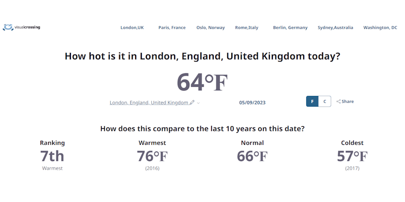 One this page you will find a list of our free weather tools and dashboards. These are all accessible without cost and typically without even needing to sign up for a Visual Crossing Weather account. (Of course, we highly recommend that you do sign up as some features are only accessible when logged into our site.) They are ideal sources of historical weather and forecast data, climate averages, energy costs, gardening information.