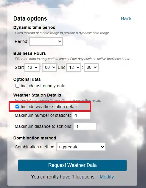To include the details of the reporting weather stations in the data output, you can enable the “Include weather station details” setting which can be found in the “Data Options” section of the query builder: