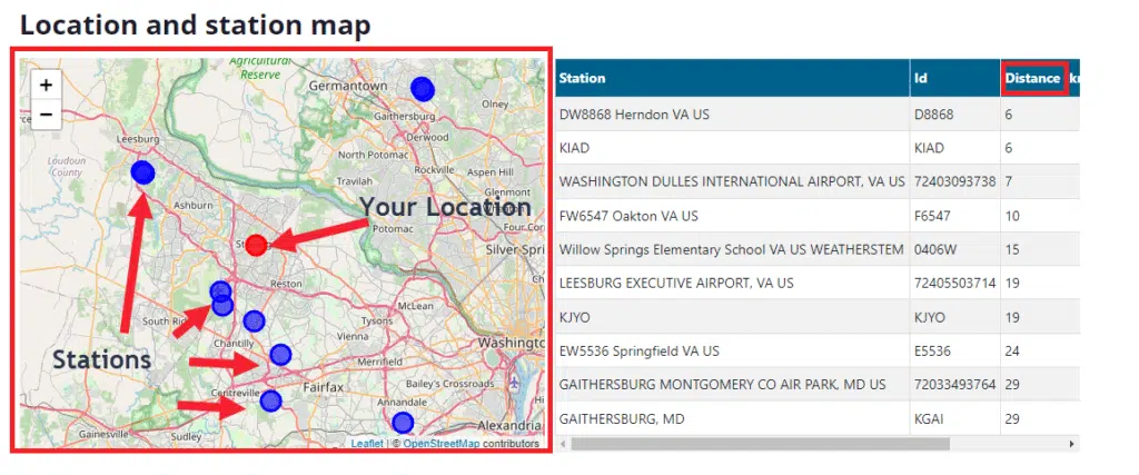 Next to the map you see a list of the stations. The list of weather stations will show the station name, ID (often the airport appended), distance from the location you entered and finally the latitude and longitude