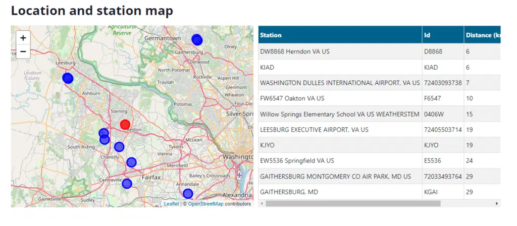 - Map of your location and the weather stations contributing to weather data for your location.
