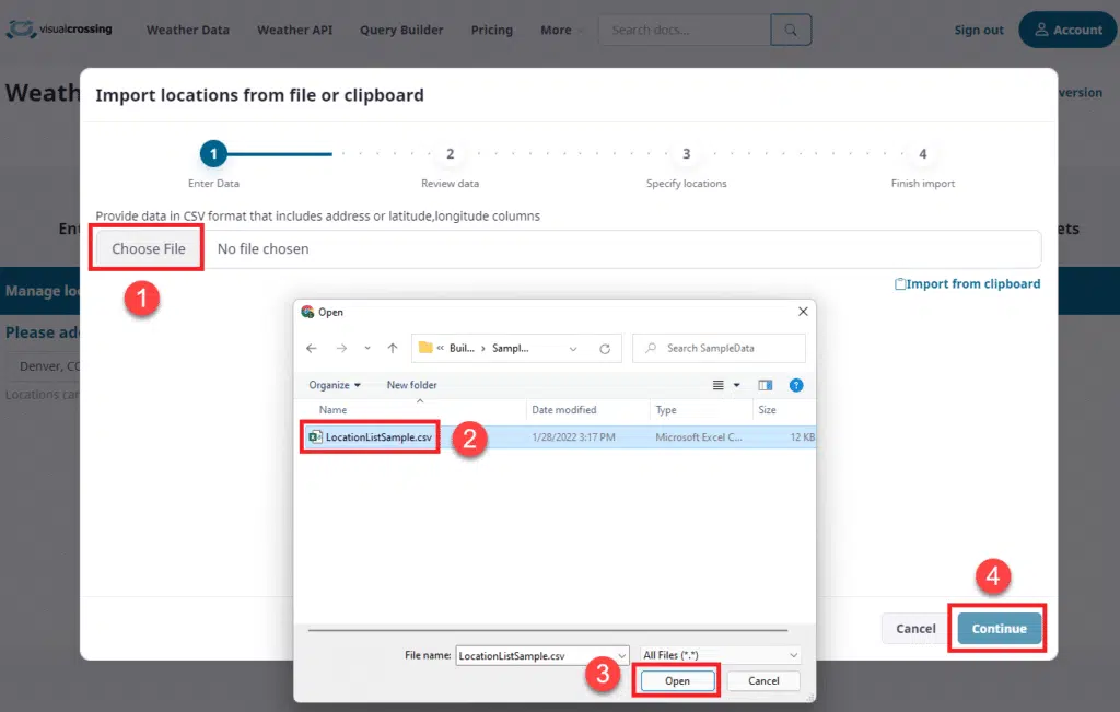 This step is an important verification step and you should look at the imported columns to determine which columns will make up your weather location address data and which column will represent the name of the location. In our example above we can choose to import using lat/longs in two different columns OR we can simply use “Address” column and let Query Builder translate the address to lat/long internally.