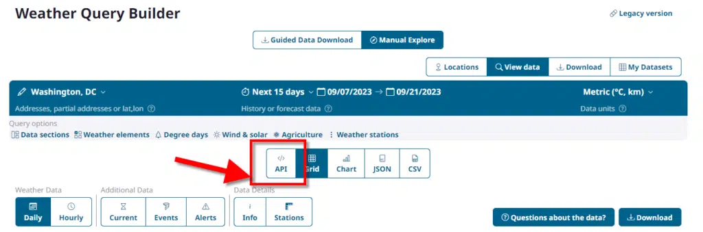 For trouble shooting purposes it is often helpful and sometimes needed to have the exact query string at hand, which is send to Visual Crossing when using the Graphical User Interface of the Web Query Builder. This helps, amongst others, with identifying connectivity problems or interface compatibilities. Moreover it is needed by our data quality assurance team in case of data questions.