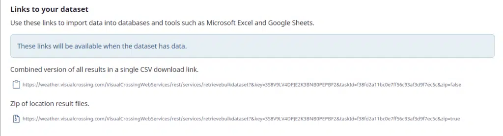 It is very important to note that these links do not cause a weather query to be executed. They simply retrieve the results from the last time that query was executed. This is valuable for at least two reasons. The first reason is that downloading from a dataset link does not incur a query charge against your account. The second is that, unlike an API query link, you do not need to wait for a weather query to run before you can retrieve the results. Since these links are retrieving a previously-run dataset, the data is available to download instantly.