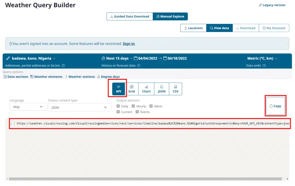 - To obtain this log into the Query Builder using your Visual Crossing Weahter account.