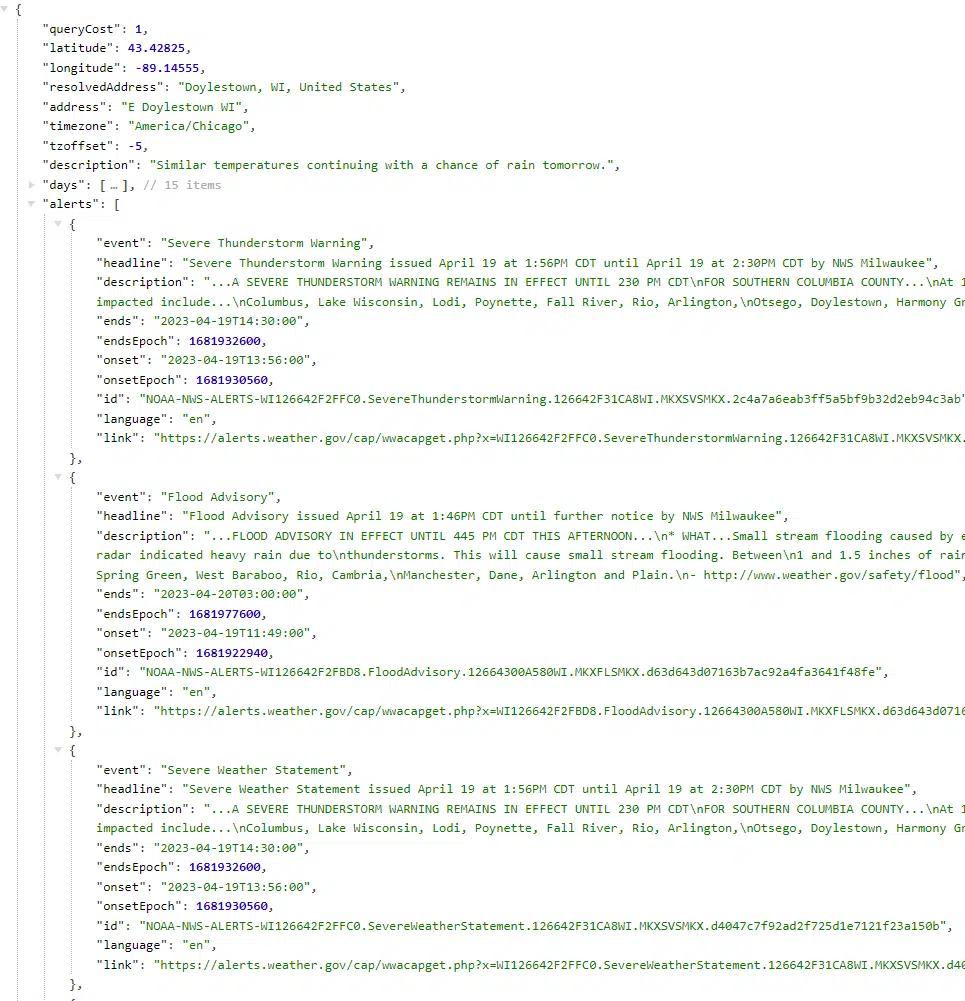 https://weather.visualcrossing.com/VisualCrossingWebServices/rest/services/timeline/E%20Doylestown%20WI?unitGroup=us&key=YOUR_API_KEY&contentType=json&include=current,alerts