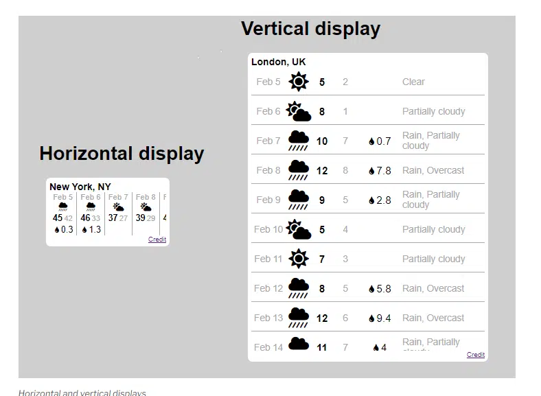 The free weather forecast widget displays up to a 15-day weather forecast in a horizontal, scrollable layout in any webpage. The forecast widget uses data from the Weather API along with HTML, JavaScript, and CSS technologies.