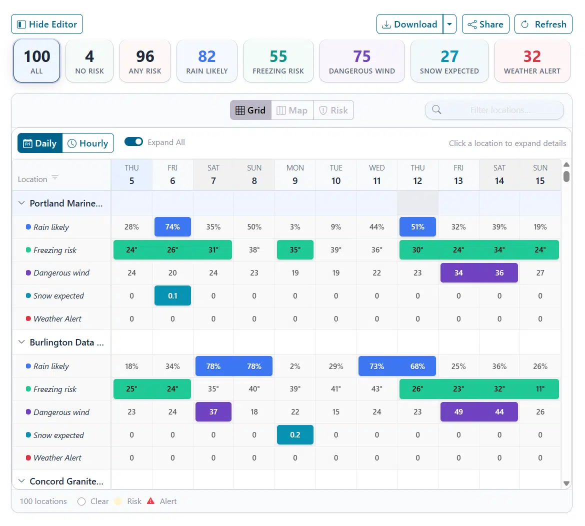 Track and analyze custom weather risks across thousands of global locations simultaneously via a centralized, color-coded dashboard.