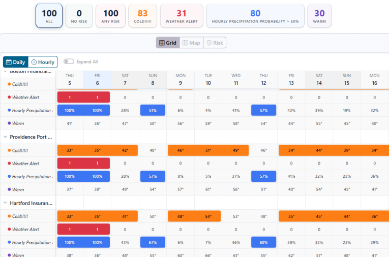 Whether it’s wind speeds for crane safety, temperature floors for concrete pouring, or lightning risks for outdoor events, you get a color-coded bird’s-eye view of your entire organization’s weather risk.